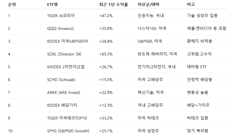 ETF 투자에 관심이 있다면 누구나 궁금해할 내용은 바로 **“ETF 수익률 순위”**입니다. 여러 ETF 중 어떤 상품이 최근 높은 성과를 냈고, 앞으로도 지속 가능한 수익을 기대할 수 있을지 알고 싶기 때문입니다. 이 글에서는 최근 1년간 ETF 수익률 순위를 살펴보고, 수익률 상위 ETF의 공통 특징과 포트폴리오 구성 팁까지 소개드립니다.