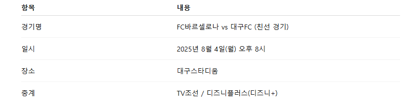 이번 경기는 바르셀로나의 ‘2025 아시아 투어’ 마지막 무대이자, 한국 팬들 앞에서 펼치는 하이라이트 경기입니다. 경기 장소는 대구스타디움, 킥오프는 저녁 8시입니다. 지금부터 FC바르셀로나 내한 축구 중계 정보와 함께 경기의 의미, 출전 선수, 시청 방법까지 모두 알려드립니다.