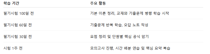 학습 계획은 개인의 일정에 따라 조정할 수 있지만, 시험일까지 단계별로 준비하는 것이 학습 부담을 줄이고 효율성을 높이는 방법입니다.